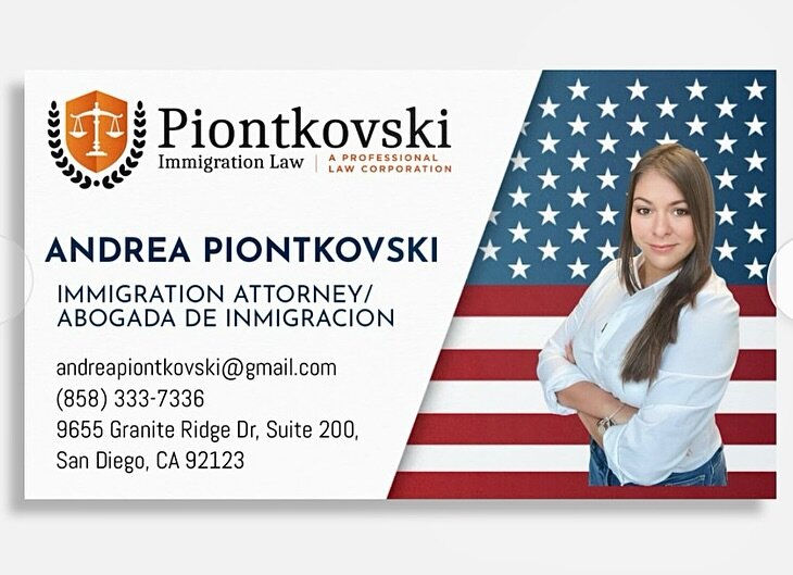 Piontkovski Immigration Law ofrece asesoría especializada en asuntos de inmigración, representada por Andrea Piontkovski, y ubicada en 9655 Granite Ridge Dr 200, San Diego, CA 92123, en contacto directo a través del (858) 333-7336 o visitando su sitio web https://andreapiontkovskilaw.com/. La ventaja de este negocio radica en su experiencia legal, enfocada en guiar a los clientes a través de los complejos procesos de inmigración de manera efectiva, asegurando los mejores resultados posibles gracias a su profundo conocimiento de la ley y su dedicación a la justicia migratoria.