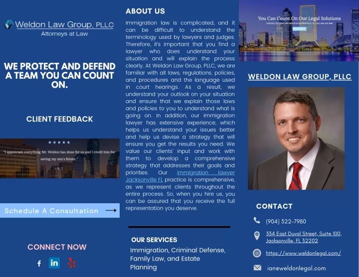 En la ciudad de Jacksonville, el bufete Weldon Law Group, PLLC se destaca por brindar asistencia legal especializada a personas y familias que buscan navegar el complejo proceso de inmigración en Estados Unidos, ofreciendo asesoría y representación en diversas áreas relacionadas con la ley de inmigración.
